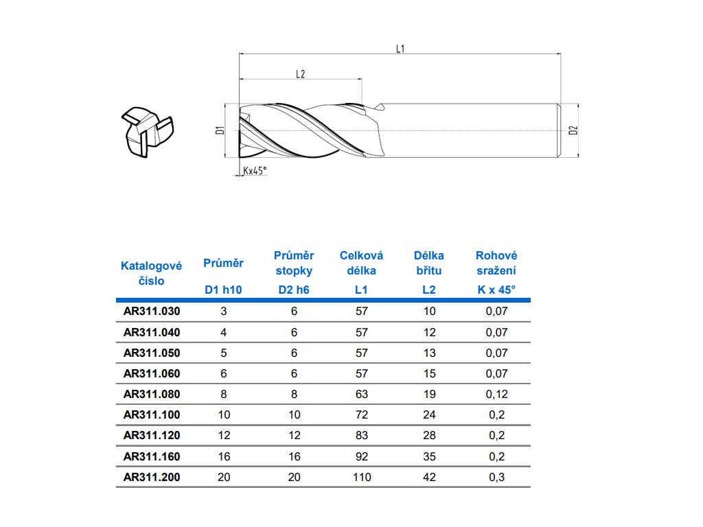 KARBIDOVÉ FRÉZY 3 BŘITÉ S TROJÍ ŠROUBOVICÍ - ALU AR311 🟢 (<55 HRC]