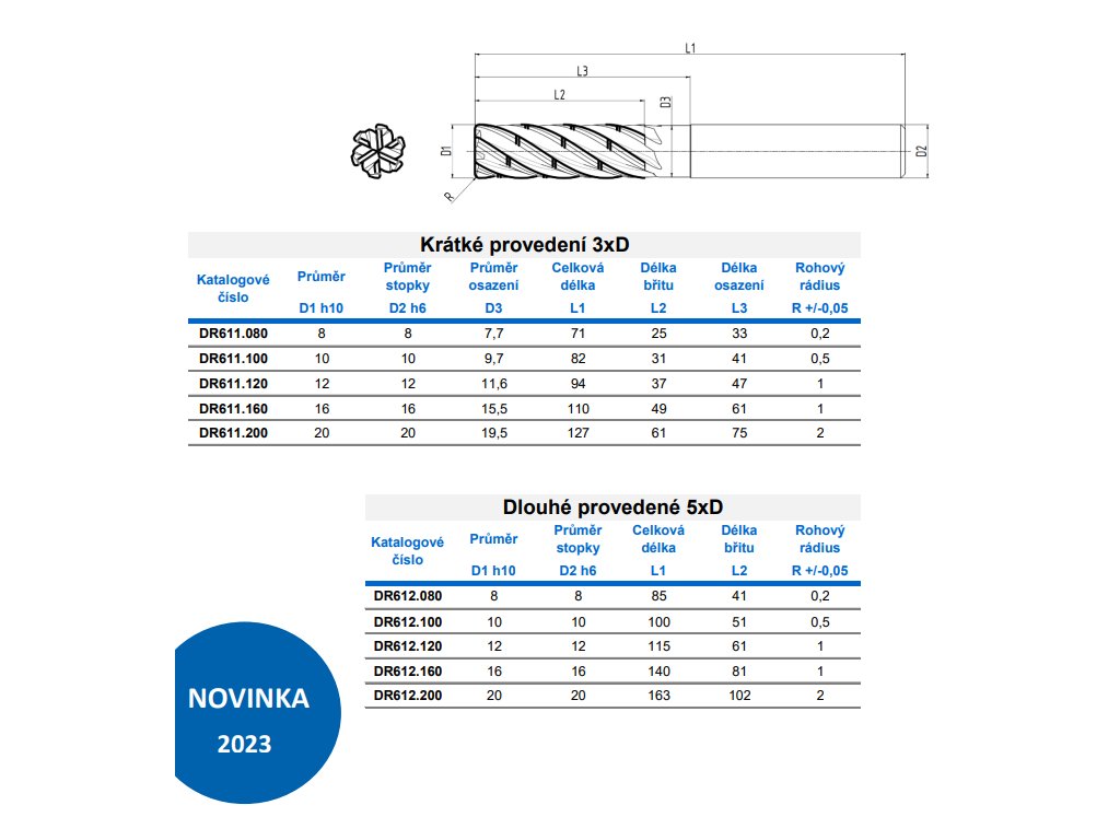 KARBIDOVÉ FRÉZY S PŘERUŠOVAČI TŘÍSEK PRO DYNAMICKÉ OBRÁBĚNÍ 6 BŘITÉ DR611/DR612 🔵🟡 (🟠)
