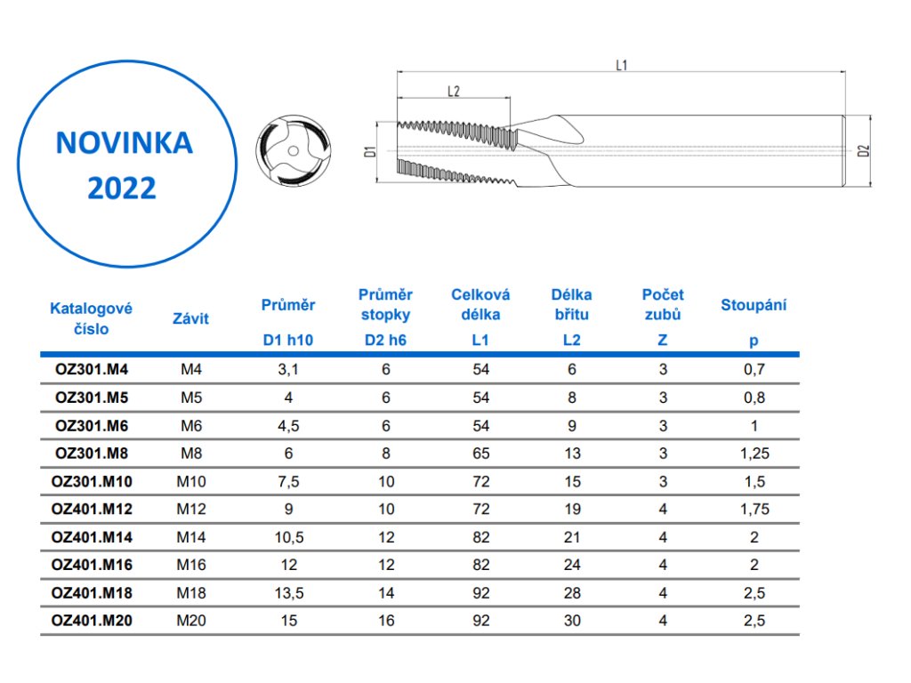 KARBIDOVÉ FRÉZY ZÁVITOVÉ PRO METRICKÉ VNITŘNÍ ZÁVITY ISO OZ301/OZ401 🔵🟡🔴🟢 (🔘 <55 HRC)